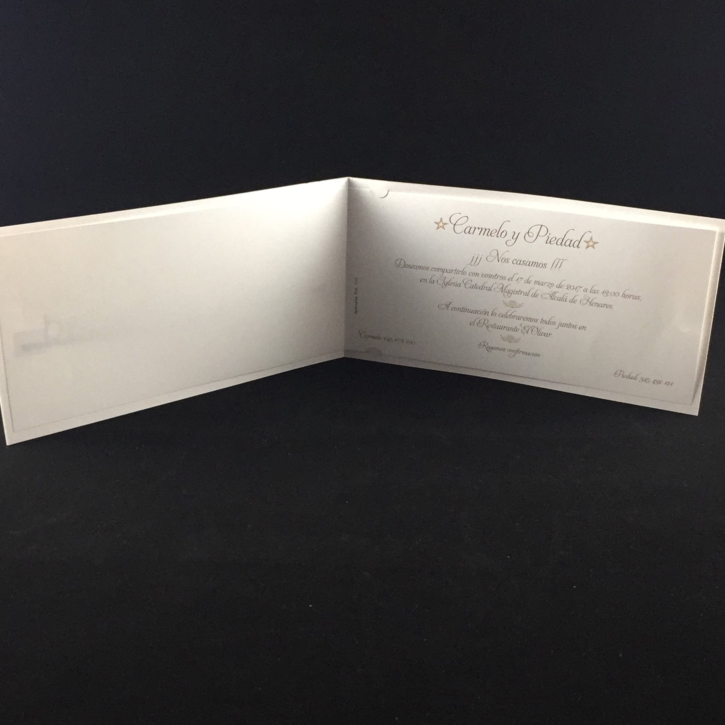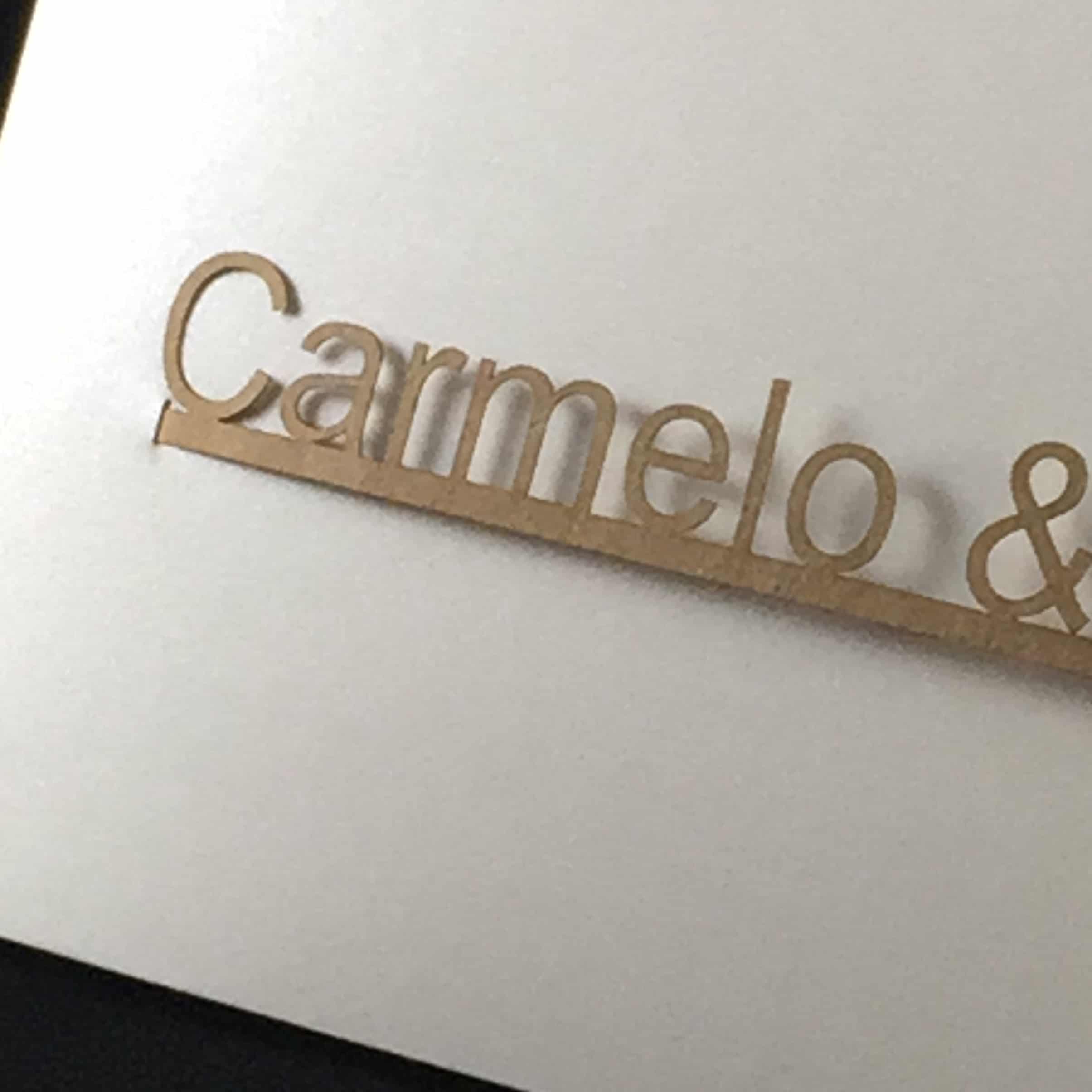 En la portada lleva los nombres de los novios troquelados con la técnica láser en cartulina kraf.
